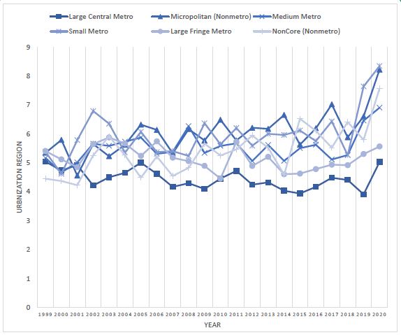 2013 Urbanization-specific mortality: From 1999 to 2020, the number of deaths related to Crohn’s disease were 9,112 in Large Central Metro, 9,091 in Large Fringe Metro, 8,597 in Medium Metro, 4,261 in Small Metro, 4,249 in Micropolitan (non-Metro), and 2,932 in non-Core (non-Metro) areas. AAMR trends from 1999 to 2020 were consistent across Large Central Metros, Large Fringe Metros, Micropolitans, and Non-Core areas, with AAPC values of -0.468, -0.374, 1.335, and 1.726, respectively. The AAPC for Medium Metro was 1.2515 (0.052 from 1999 to 2018 and 13.386 from 2018 to 2020), and for Small Metro, it was 2.0151 (0.327 from 1999 to 2018 and 19.598 from 2018 to 2020). Pairwise comparisons revealed significant (p<0.05) non-parallel trends between these groups: Large Central Metro and Small Metro, Large Central Metro and Micropolitan, Large Central Metro and Non-Core, Large Fringe Metro and Small Metro, Large Fringe Metro and Micropolitan, and Large Fringe Metro and Non-Core areas. The non-parametric trend test in STATA produced a z-value of 6.32 (p>z=0.00). The independent Kruskal-Wallis test with post-hoc Dunn’s test rejected the null hypothesis that “AAMR distribution is the same across Urbanization groups,” with a p-value of 0.000.