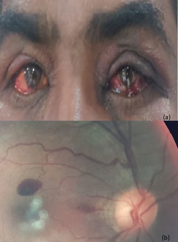 A 48-year-old male with a history of significant alcohol consumption (120 gm per day for six years) and a recent binge presented with jaundice for one month followed by abdominal distention for ten days. At presentation, he was normotensive (BP 110/70 mmHg), had tachycardia (HR 122/min), and maintained saturation at room air (Sp02 98%). Physical examination was remarkable for scleral icterus, palmar erythema, enlarged liver (span 14 cm), and free fluid in the abdomen. Laboratory investigations revealed anemia (Hemoglobin 10.1 gm%), leucocytosis (White blood cell count 17000/mm3), thrombocytopenia (Platelet count 90 X 103)/mm3), deranged liver function tests (Total bilirubin 9.5 gm/dl, Alanine Transaminase 52 U/L, Aspartate Transaminase (112 U/L), and coagulopathy (International normalized ratio 2.2, Prothrombin time 20 sec). A provisional diagnosis of Acute on Chronic Live Failure (ACLF) with severe alcoholic hepatitis as the precipitating event was made. The patient was started on standard therapy with nutritional supplementation, diuretics, laxatives. On day 4 of admission, the patient developed bilateral red-eye. There was no history of any diminution of vision, double diplopia, ocular discharge, orbital pain, antecedent trauma, cough, or any interventional procedure. Vision, pupillary reflexes, intraocular pressure as well as range of extraocular movements were normal.