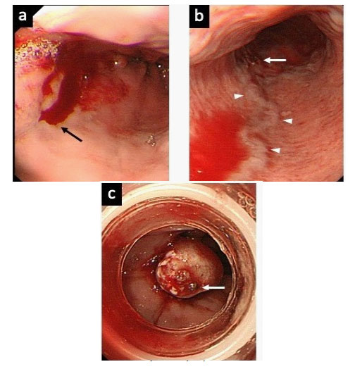 Upper GI tract bleeding was shown endoscopically as oozing from a small varix located in the distal esophagus, and EVL was performed at the bleeding point (Figure 1).