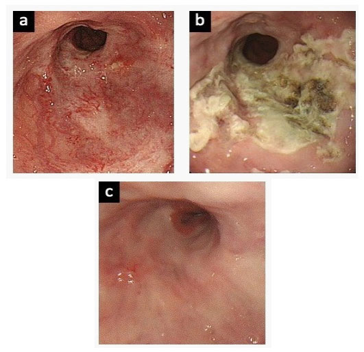 A 71-year-old woman presented to our department with a 3-day history of passing melena. The patient reported not eating or drinking much that day. She had no complaints of fever, abdominal pain, or weight loss/gain. She was a non-smoker and non-drinker. She had no history of coming into contact with sick people or antibiotic drug use. Her past medical history was notable for localized scleroderma (also known as morphea) and arthritis. Regular medications included bucillamine, beraprost sodium, and celecoxib. At presentation, her vital signs were as follows: temperature, 36.6°C; heart rate, 64 beats/min; respiratory rate, 14 breaths/min; and blood pressure, 111/77 mmHg. On examination, the patient complained of mild discomfort but no acute distress. Her abdomen was soft and nondistended with positive bowel sounds.