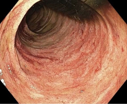 A 60 year old male with a recent diagnosis of C. difficile colitis was admitted to the emergency department with syncope and failure to thrive. His past medical history was notable for chronic inactive hepatitis B, peripheral T cell lymphoma on azacitidine and cyclophosphamide, doxorubicin, vincristine, and prednisone, and chronic HLTV 1-2. The patient reported 6 days of nausea, vomiting and watery diarrhea occurring approximately 2-3 times daily, with associated petechial rash over his torso as well as all four limbs. On examination he was found to be tachycardic and hypovolemic which responded well to fluid resuscitation. Physical examination was notable for a bilateral petechial rash on his legs, arms, and torso, the rest of the examination was unremarkable. His labs were notable for hemoglobin of 11.3 g/dL, normal white blood cell count, but with 90% neutrophilia, ALT 135 U/L, total bilirubin of 6.8 mg/dL, direct bilirubin of 5.6 mg/dL, and alkaline phosphatase of 221 U/L, and albumin of 1.6 g/dL. Abdominal US revealed gallbladder sludge and common bile duct of 9 mm, but MRCP did not show any choledocholithiasis or biliary dilation. On hospital day four, the patient acutely developed melena, hematochezia, hemodynamic instability, and hemoglobin nadir to 5.5 g/dL packed red cell transfusions requiring emergent EGD and flexible sigmoidoscopy showing diffuse mucosal oozing in the upper and lower GI tracts with ulcers with a moth-eaten appearance (Figure 1). Biopsies were taken.
