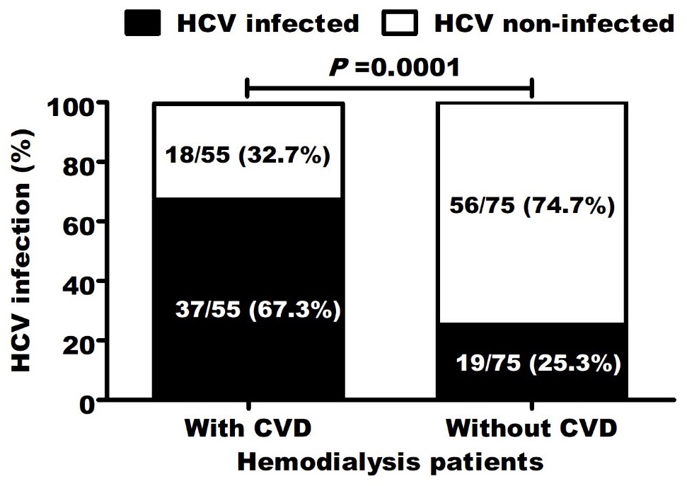 In this study, multiple logistic regressions, that adjusted other demographic and clinical characteristics, revealed that HCV infection (P=0.015) was independently related to CVD development [OR=5.948, 95 CI (2.7-13.1)]. Interestingly, HCV-infected patients were significantly associated with other CVD risk factors including increased body mass index, carotid thickening, long dialysis duration and dyslipidaemia.