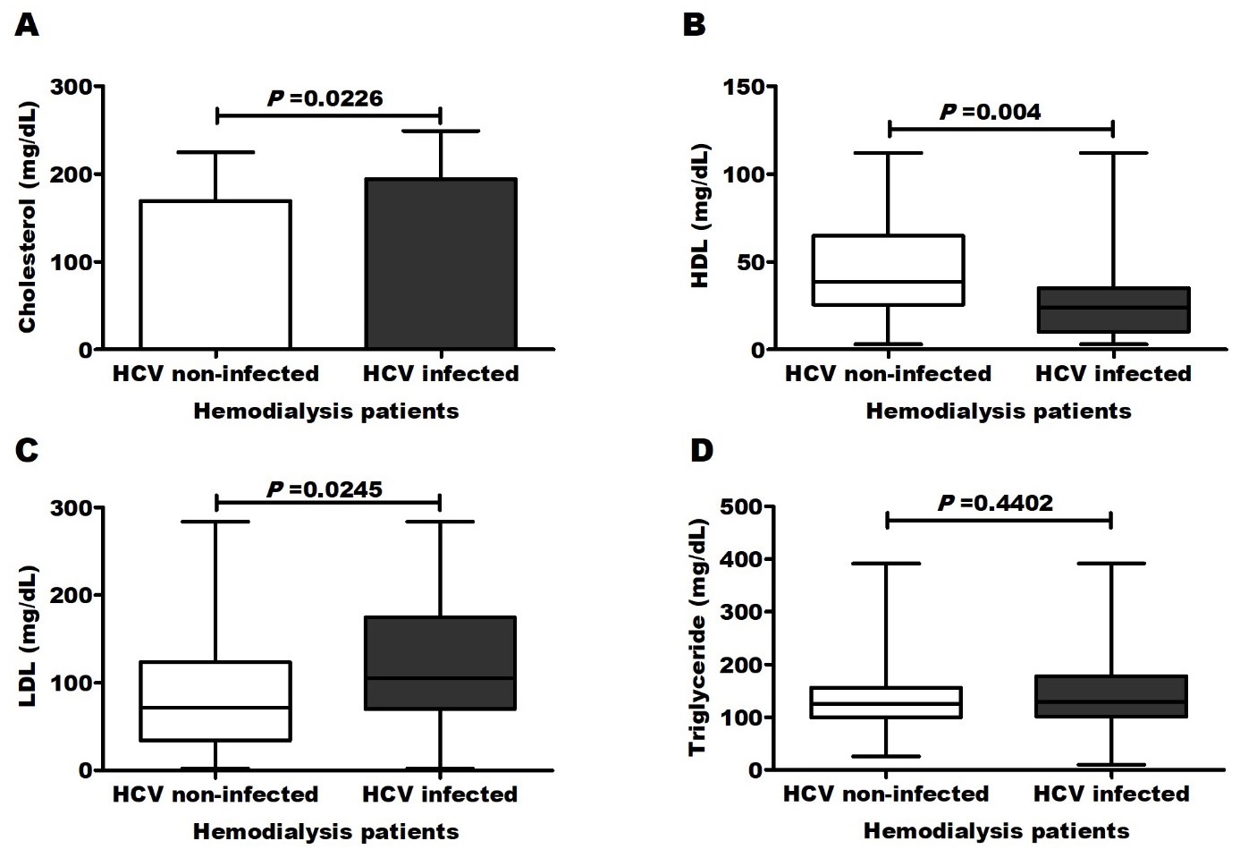 Here and among all studied parameters, CVD development was significantly correlated with HCV infection (r=0.415; P=0.0001) as well as other CVD traditional risk factors in dialysis patients including increased body mass index [13], carotid thickening [14], long dialysis duration [15] and lipid alterations including decreased high-density lipoproteins and elevated cholesterol, triglycerides, low- and very low-density lipoproteins [16]. Compared to uninfected patients (25.3%), high percentage (67.3%) of HCV-infected patients was with CVD.
