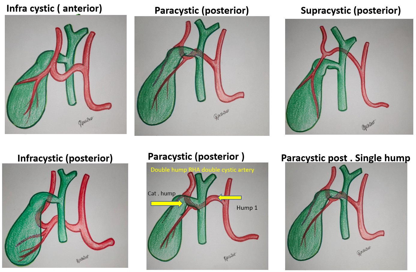 1) Supracystic: The hump is either anterior or posterior to CHD, superior to the cystic duct, nearer to hilum of liver. Here the cystic artery is long, originating from inferior part of loop hump. Due to long cystic artery, and hump remaining away from surgical dissection, mishaps are less during surgery