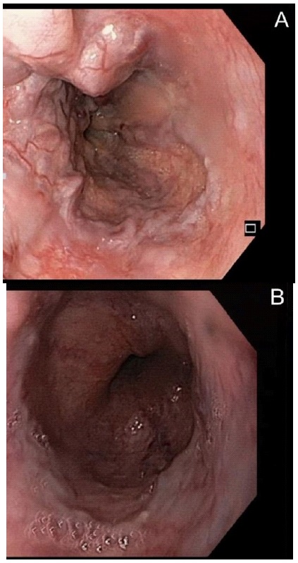 In 2016 the patient was hospitalized due to sudden hematemesis, laboratory analysis showed: Hb 8.5 g/dl (normal range 13-18 g/dl), Plt 69x109 /l (normal range 150-450 X 109 /l), INR 1.49 (normal range 0.80-1.20), PT ratio 1.51(normal range 0.80-1.20), aPTT 83s (normal range 28-40s), while the gastrosco gastroscopy immediately performed revealed the presence of F2 esophageal blue varices (RWM++, CRS++) and clear signs of bleeding. He underwent a first successful endoscopic band ligation under pdFVIII coverage (45 IU/k) in addition to tranexamic acid to maintain the FVIII level 0.80 IU/ml the day of ligation procedure, reduced to 33 IU/Kg to ensure a FVIII level of 0.50 IU/ml in the ten days post-procedure without any bleeding reported. Subsequent follow-ups showed no relapses until February 2018, when following epigastric pain and melena the patient went to the Emergency Department. The gastroscopy performed at the admission therefore revealed a new presence of varicose cords F2B at bleeding risk (RWM+++-; CRS++--; HCS++--), while the laboratory analysis showed severe anemia (HB 4.4 g/dl) and thrombocytopenia (31x109 /l) treated with red blood cells and fresh frozen plasma transfusion.