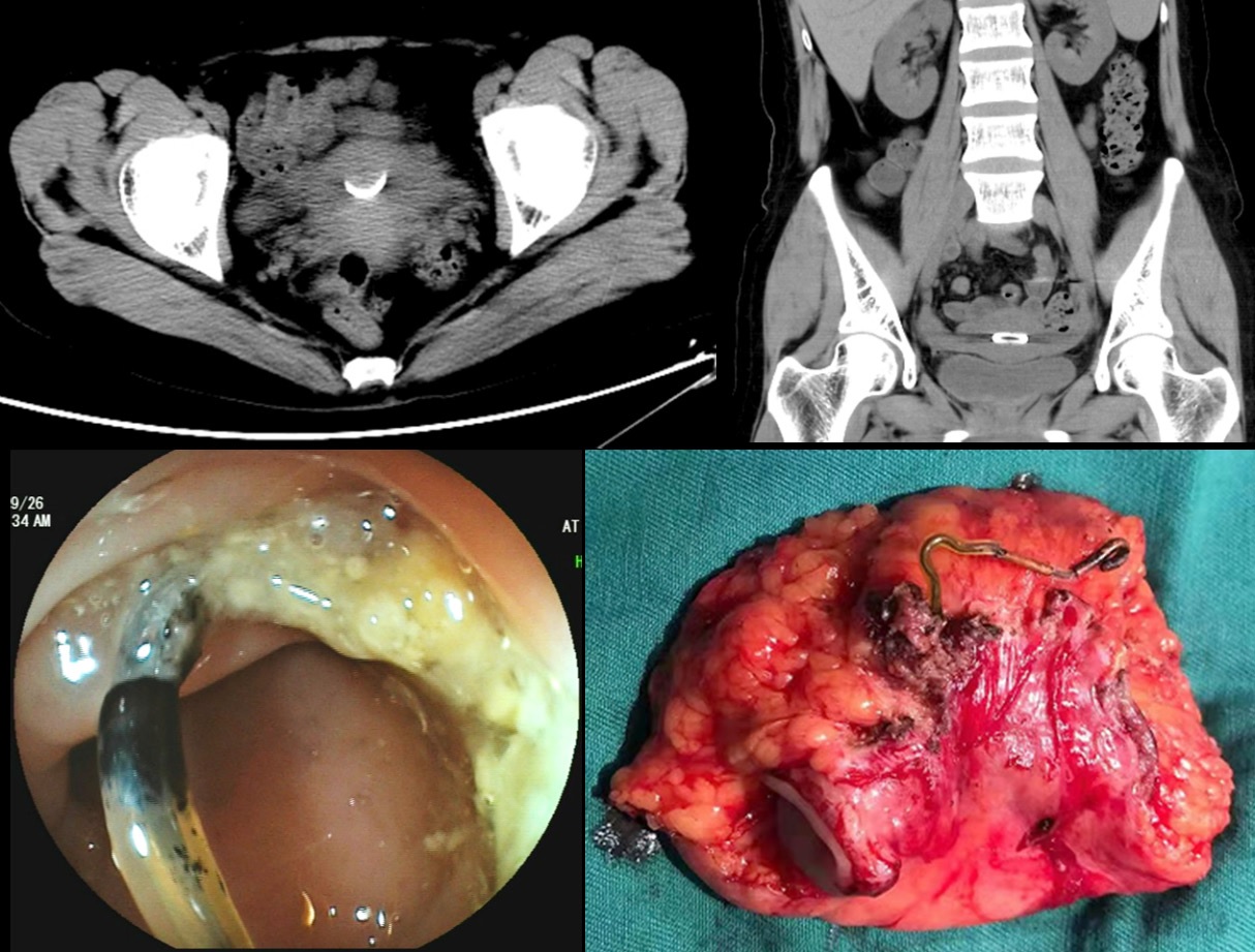 A 38-year-old woman was transferred to our hospital with a 10-day history of lower abdominal pain and vomiting. She had no significant surgical and medical history. Physical examination showed no specific abnormality. Computed tomography of the abdomen and pelvic cavity incidentally showed a thin, irregular foreign object embedded in the right lateral wall of the rectum (Figure 1A and 1B). Colonoscopy confirmed perforation of the rectum by a thin metallic object (Figure 1C). On detailed questioning, she recalled having an intrauterine device inserted 9 years ago. The patient received the diagnosis of rectal perforation by an intrauterine device. The device was successfully removed laparoscopically by performing a partial rectectomy (Figure 1D). The postsurgical course was uneventful and she became asymptomatic after the procedure. As a safe and effective birth control method, insertion of intrauterine contraceptive device is very popular in China. However, the migrated device may present as bleeding, abdominal pain, and even colonic perforation although most of the perforations are asymptomatic [1]. Migrating intrauterine contraceptive devices are usually involved in the sigmoid colon, which is the most commonly penetrated part of the colorectum [2]. As a rare complication of intrauterine device insertions, Uterine perforation may subsequently result in rectal perforation in our case. Minimally invasive techniques such as colonoscopy and laparoscopy are usually performed to remove the device eroding the colon wall [3].