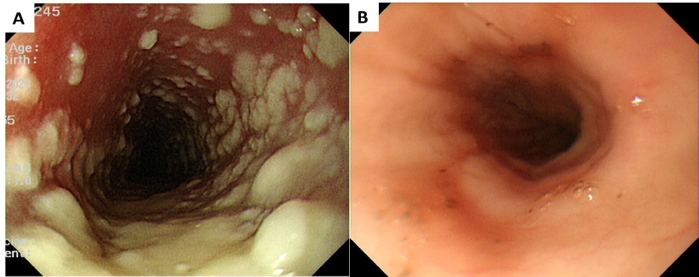 The incidence of oesophageal candidiasis is 0.32% to 5.2% in the general population. The risk factors for oesophageal candidiasis include early or late age, use of proton pump inhibitors, smoking, an immunocompromised state and long-term treatment with antibiotics or corticosteroids [1,2]. Oesophageal candidiasis usually responds well to systemic antifungal therapy. Differential diagnoses, such as herpes simplex virus, cytomegalovirus, pill-induced oesophagitis, eosinophilic oesophagitis, radioactive oesophagitis, gastroesophageal reflux disease, and other types of oesophageal mucosa inflammation, should be considered in clinical practice [1-3].