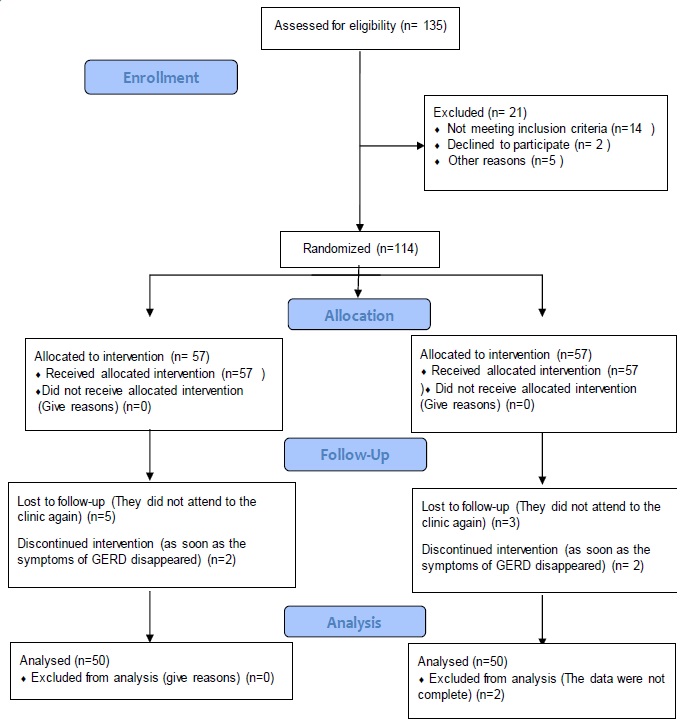 Oral ranitidine was administered 2 mg/kg/dose three times daily to fifty-seven neonates in group A and oral esomeprazole 0.5 mg/kg/dose twice daily to another fifty-seven neonates in group B. The first neonatologist (researcher) recorded the demographic data including age, gender, birth weight, and weight at presentation along with scoring of GERD presentations before intervention. The same neonatologist reevaluated the post-interventional weight and clinical scoring after one week and one month. In each group, seven patients lost to follow-up or discontinued intervention or their data were not complete. In the end, fifty neonates in each group completed the study and their data were analyzed (figure 1). Changes in the scoring of GERD-related clinical presentations from pre-intervention to the end of the study were considered as the primary outcome. The secondary outcome was defined as adverse reactions following oral administration of ranitidine or esomeprazole.