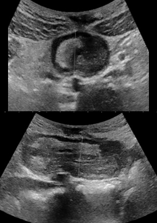 A 15-year-old male patient, with a history of intermittent abdominal pain, two episodes of bleeding considered to anal fissure, and of chronic constipation consulted twice in the emergency department for ileo-ileal intussusception more than a year apart. At the first presentation, the patient consult with the general condition preserved, apyrexia, bilious vomiting. The physical examination found pain in the right hypochondrium and sub umbilical, a soft abdomen, no tusks or palpable abdominal mass. The ultrasound performed found ileo-ileum intussusception without any sign of complication with the intussusception tube in the pelvic position (Figure1).