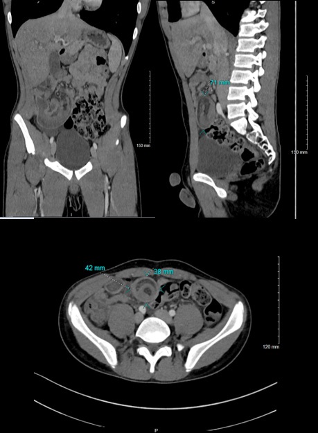 An abdominal computed tomography found the presence of an ileo-ileum intussusception in the right iliac fossa (the sausage 42 x 38 mm in diameter and 71 mm in length) whose content is a fatty image within the infiltration linked to the intussusception of the mesenteric fat, the presence of signs of early intestinal pain. Furthermore, there was no parietal enhancement defect, no identifiable underlying mass syndrome, but the presence of submillimetric nodal formations with the neighboring minor axis (Figure 3).