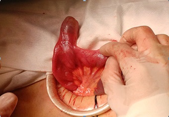 An urgently laparoscopy management found an ileo-ileum intussusception sausage in the epigastric region. The partial laparoscopic reduction of the small intestine discovers a mesenteric fat and did not complete reduction (Figure 4). A conversion to the periumbilical minilaparotomy using the Alexis retractor was done and found the MD approximately to 60 cm from the Bauhin's valve with good staining, without necrotic lesions (Figure 5). Subsequently, a segmental small-bowel resection with primary anastomosis was performed.