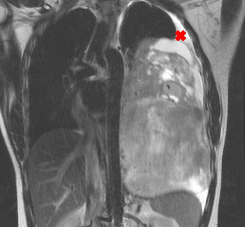 A 28-year-old male patient presented with onset of pain on his left hemithorax and progressive fatigue, in September, 2020. He had no previous comorbidities. An investigative MRI (magnetic resonance imaging) scan showed a large and heterogeneous mass on his left hemithorax with partial lung atelectasis, inferior displacement of diaphragm, mediastinal shift to the right and small pleural effusion (Figures 1a, 1b and 1c). The tumor was in contact with the inferior esophagus and the descending aorta. The thoracic wall (muscle and ribs) was not compromised. These findings suggested, possibly, a mass of pleural origin. An initial core-needle biopsy was performed in October, 2020 to clarify the diagnosis.