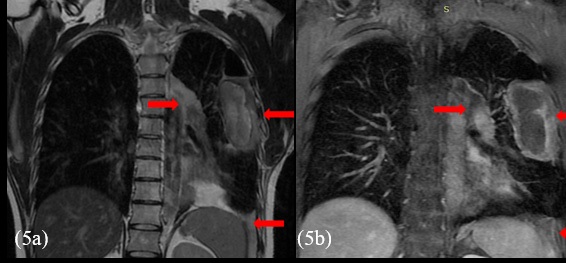 The patient presented with voluminous and symptomatic disease less than six months of chemotherapy end and less than two months of radiotherapy. He restarted with pain in left hemithorax, cough, shortness of breath, lack of appetite and daily vespertine fever. MRI scans in August, 2021 showed new lesions on pleural surfaces beyond the residual mass previously seen (Figures 4a, 4b and 4c). One of the lesions, on the extra-pleural fat adjacent to the diaphragm, extended inferiorly, pushing downward the muscle.