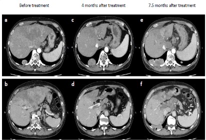 After 4 months and six cycles of combination therapy, abdominal CT was conducted with the tumor assessment. Contrast-enhanced CT revealed size reduction of the primary liver tumor (Figure 1c). However, progression of PVTT was observed (Figure 1d). Despite lack of apparent ascites, lung metastases were increased in size (Figure 2b). In addition, serum DCP and AFP levels had also increased. According to the modified Response Evaluation Criteria in Solid Tumors (mRECIST) [8], the tumor response was considered to be Progressive Disease (PD).