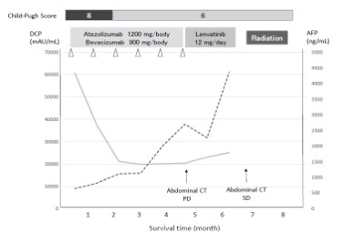 Although the patient was relatively young and had a good performance status score (0), current Japanese clinical guideline indicated that he was ineligible for systemic chemotherapy due to poor liver function (CP-B; score 8) [4]. However, we recommended atezolizumab (1,200 mg daily) plus bevacizumab (900 mg/body) as first-line treatment due to an expected improvement in liver function. Since no clinical trials for patients with CP-B were available, informed consent was fully obtained from the patient prior to treatment. After one cycle of this immunotherapy of combination regimen, his DCP level decreased to 37,437 mAU/mL. As expected, total bilirubin decreased to 0.9 mg/dL, and liver dysfunction improved to CP-A (score, 6). Considering this response to atezolizumab plus bevacizumab treatment, we recommended the patient to continue with this regimen.