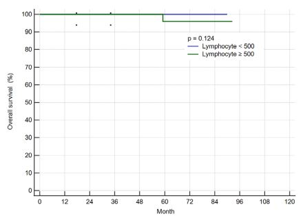 Figure 2 shows the relationship between lymphocytopenia and DFS. Lymphocytopenia is associated with reduced DFS (p = 0.038). Figure 3 showed the relationship between OS and lymphocytopenia. OS was not significantly correlated with lymphocytopenia (p=0.124).
