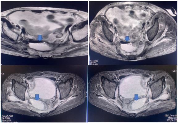 A 59-year-old man has complained of pus and mucus discharge from the anal region, as well as intermittent fever episodes, for the past two years. Three years ago, he developed symptoms of per rectal bleeding and was diagnosed with Carcinoma rectum, for which he received three cycles of neoadjuvant radiotherapy followed by laparoscopic anterior resection with a defuncting descending colostomy. He was discharged on post-operative day 8, with no issues reported. Adjuvant Chemotherapy was administered in 13 cycles. After 6 months of surgery, a CT abdomen was performed, which showed post-op changes in the pelvis with Pelvic peritoneal fat stranding and widening of the presacral space. He was having repeated episodes of fever with chills and pus discharge per anus that were resolved with IV antibiotics. After 6 months, an MRI of the pelvis revealed a significant collection of size 9.1 x 5.2 x 8.8 cm with air loculi at the presacral area-most likely a controlled leak (Figure 2). The conservative approach was continued for another six weeks, during which an intermittent fever with mucus and pus discharge from the anal region persisted. A colonoscopy was performed, which showed the cavity and confirmed the findings (Figure 4). Endovac sponges were sutured to RT and placed directly into the cavity with the help of a colonoscope after debriding and irrigating the cavity. After applying post-E-VAC therapy, the patient improved and had no fever after 48 hours. The procedure was repeated on an OPD basis four more times, with the endovac in place for five days each. At each session of endoscopy, there was a reduction in the size of the sponge used and considerable improvement in terms of the size of the cavity and the amount of slough (Figure 5). The cavity completely healed 10 weeks after E-VAC therapy, and the patient has been asymptomatic for the past 4 months. A CT scan showed complete resolution of the leak.