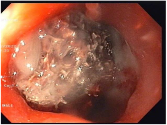 A 31-year-old female patient with a Bochdalek hernia with complete stomach migration into the left pleural space and ischaemia. Intraoperatively, after bringing down the stomach, the proximal half was found to be gangrenous with perforation. Upper partial gastrectomy and esophagogastric anastomosis were performed. The surviving stomach was oedematous and ischemic, but not gangrenous. A CT scan with intravenous contrast 48 hours later revealed a severely ischemic stomach, raising concerns about its viability. A recheck laparotomy to test the stomach remnant revealed considerable edoema but looked viable. The anastomotic site looks healthy. On the 12th postoperative day, an oral contrast study revealed a frank leak from the anastomosis, with the infected collection tracking up to the left perinephric space, with endoscopy confirming the results (Figure 6). At this point, management options were limited. The covered stent and reoperation were deemed risky. Endoscopic Vacuum (E-VAC) therapy was considered a safe choice in these conditions.