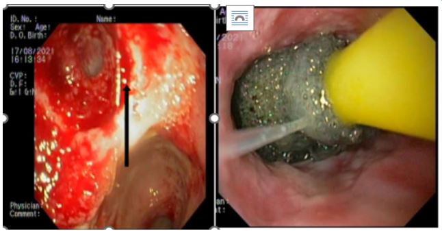 With respect to the second case, Esophageal leaks have been observed to occur in approximately 35% of cases involving esophagectomis. The mortality rate associated with esophagectomy procedures can reach up to 15%. Among these cases, approximately 40% of the mortality is attributed to oesophageal leaks [9]. The available treatment modalities encompass surgical repair, endoscopic stents, endoscopic clips, glue, and Endovac therapy. Surgical intervention is recommended for patients who are in an unstable condition. Endoscopic stenting is frequently employed for the management of patients in stable conditions. The phenomenon of stent migration has been observed in a range of 3-35%, with plastic stents being more frequently associated with this occurrence [10]. The OTSC, or Over-The-Scope Clip, is an emerging device used for the closure of gastrointestinal leaks following endoscopic or surgical procedures. It is increasingly being recognised as a viable treatment option for leaks and fistulas. However, it is important to note that there are certain limitations associated with its use, such as the presence of nonviable tissue surrounding the defect margin, particularly in cases that are detected at a later stage, as well as the requirement for precise tip alignment [11-13].