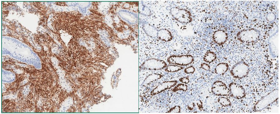 A 36-year-old male patient presented to our outpatient clinic in September 2022 with weakness, fatigue, bloody diarrhea, abdominal pain and weight loss. In June 2022, the patient was evaluated at another hospital with similar complaints, was diagnosed with UC by colonoscopic examination; and methylprednisolone was started. But his complaints did not regress and he lost approximately 10 kg, and HIV infection was diagnosed in July 2022. CD4 T lymphocyte count was detected 29%; biktegravir/emtricitabine/tenofovir alafenamide was initiated. He only mentioned that he was homosexual. Physical examination revealed abdominal tenderness. The patient complained of bloody and mucous stools more than 10 times a day and weight loss continued. Fecal calprotectin was 993 ug/g (0-50 ug/g); Cryptosporidia, Giardia and Entamoeba antigens were negative; Salmonella spp., Shigella spp., Plesiomonas spp. and Aeromonas spp. were negative. Clostridium difficile toxin A-B were negative. Stool analysis showed leukocytes and erythrocytes. In laboratory tests; leucocytes: 4620/µL, lymphocyte: 1220/ µL, hemoglobin: 9.5 g/dL, C-Reactive Protein (CRP): 53.9 mg/L were detected. The patient was started on methylprednisolone 1 mg/kg and mesalazine granule 3 g and mesalazine enema 1x4 g. Two weeks later, the patient’s number of bloody and mucous stools decreased and his abdominal pain regressed; but since a proximal myopathy developed, the dose of methylprednisolone was reduced and Azathioprine (AZA) 1 x 50 mg was added to treatment. The patient admitted a few weeks later and stated that he did not take his medication regularly, so the number of stools increased again and he continued to lose weight. In a new colonoscopic examination, active colitis was observed throughout all colon segments; and multiple and ulcerated mass-like reddish nodules which merged with each other and small pseudopolyps were observed on the mucosa (Figure 1). Histopathologically, the lesions consisted of spindle cells and irregularly distributed vascular proliferations was found; active chronic colitis was also determined in the surrounding mucosa of the lesions. On immunohistochemistry, the lesional cells were positive for CD34 and HHV-8. And with these findings, the diagnosis of KS was confirmed (Figure 2).