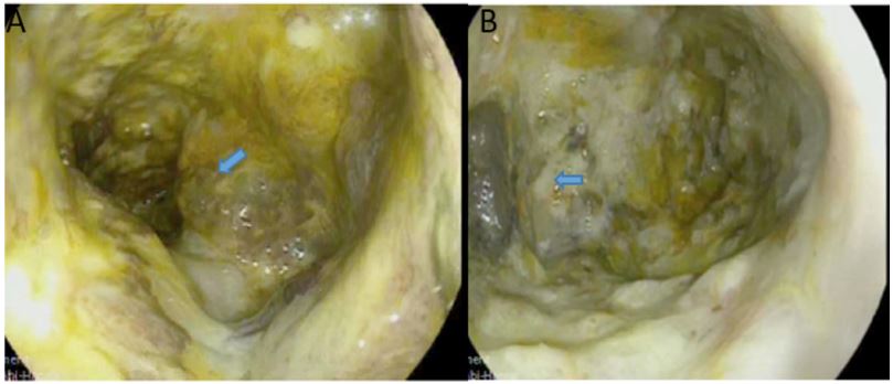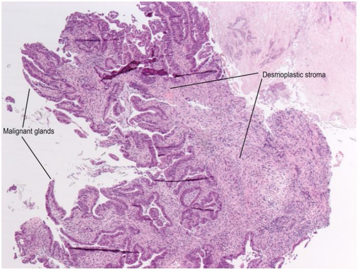 A 70-year old female was referred to the emergency department of a tertiary hospital by her general practitioner with a sixmonth history of lethargy, six-kilogram weight loss and vague right sided abdominal pain. She denied vomiting, altered bowel habit or rectal bleeding. Her relevant surgical history included cholecystectomy and thyroidectomy. There was no family history of colorectal cancer. Pertinent examination findings included a soft, non-distended abdomen with a large non-mobile palpable mass in the right upper quadrant. Her blood profile included leukocytosis (12.9 x109 /L), anaemia (Hb 79 g/L), normal bilirubin and mildly deranged liver function tests. Furthermore, she had a markedly raised CA 19.9 (5506 kU/L) and CEA (462.1 microg/L). She was admitted for a blood transfusion and further investigations. A triple phase computed tomography scan of the chest, abdomen and pelvis revealed an 11x10x10.5 cm hepatic flexure mass with invasion into the right hepatic lobe (Figure 1). Surprisingly, there was no evidence of colonic obstruction, nor distant metastatic disease. A colonoscopy demonstrated a large circumferential, fungating and partially obstructing mass extending into the ascending colon (Figure 2). Biopsy confirmed a poorly differentiated invasive adenocarcinoma (Figure 3). Following discussion at a multi-disciplinary surgical oncology meeting, she proceeded to an ileo-colonic bypass with planned adjuvant chemotherapy. Intra-operatively, the mass was invading the liver, with small amounts of ascites and no peritoneal metastasis. Proximal small and large bowel were of normal caliber. An ileo-colic side-to-side anastomosis was performed using the distal ileum and mid transverse colon. The patient made an uneventful recovery and was discharged day four post operatively with medical oncology follow up.