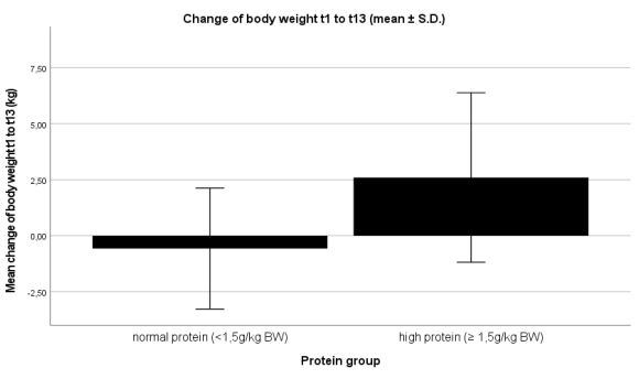 CRP: CRP did not change in HP. In NP there was a significant decrease from t1 to t13 (p=0.031). The development over time was significantly different between groups (p=0.039). There was a significant correlation between a higher mean protein intake (g/kg BW) during t1 to t13 and an increase in CRP during t1 to t13 (p=0.016) (Figure 3).