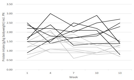 Figure 4 shows the individual protein intakes including PN. It is interesting to note that protein intakes varied widely over the 13 weeks.