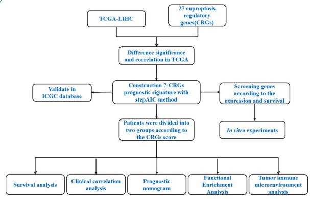 Abbreviations: RCD: Regulated Cell Death; TCGA: The Cancer Genome Atlas; ICGC: International Cancer Genome Consortium; OS: Overall Survival; HCC: Hepatocellular Carcinoma; TACE: Transcatheter Arterial Chemoembolization; TCA: Tricarboxylic Acid; OXPHOS: Oxidative Phosphorylation; ATP: Adenosine Triphosphate; TIME: Tumor Immune Microenvironment; CRGs: Cuproptosis Regulatory Genes.