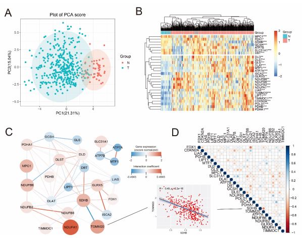 The flow chart shows the overall experimental design of this study (Figure 1). Next, we firstly curated a catalog of 27 CRGs (shown in Table S1) that function closely with cuproptosis and mitochondrial respiration. The results of GO and KEGG analysis showed that the 27 CRGs were largely related to the processes like TCA cycle, carbon metabolism, lipoic acid metabolism (Figure S1), which indicated the CRGs we selected were relative reliable. Then Principal Component Analysis (PCA) was performed based on the expressions of the CRGs, it can be seen from the figure that there is obvious classification between tumor and normal tissues (Figure 2A). Moreover, a heatmap showed the different expression of CRGs between tumor and normal tissues in HCC patients from TCGA was shown in Figure 2B. To further explore the mode of interactions between the selected CRGs, PPI analysis was retrieved via the STRING database (Figure 2C), and investigated the correlation between the expression of the CRGs, which revealed strong associations (Figure 2D). For instance, TOMM20 was highly and positively correlated with SDHB (R=-0.49, P=2.2×10-16) (Figure 2D).