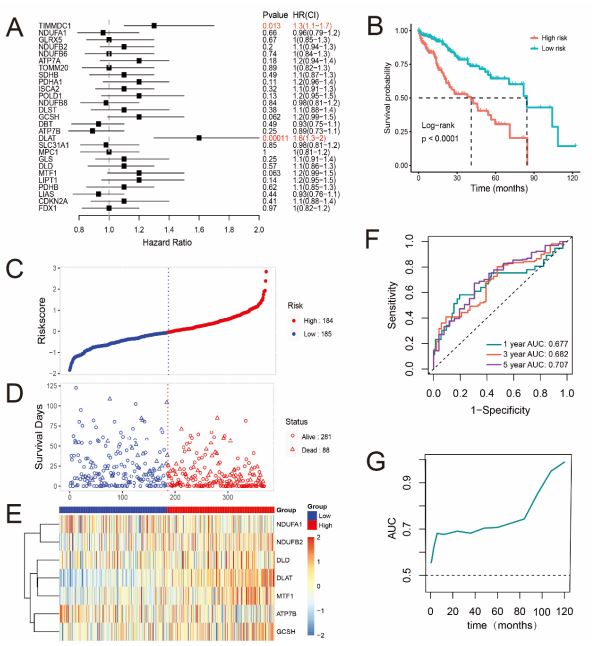 Notably, we developed a prognostic risk model based on 7 genes (NDUFA1, NDUFB2, DLD, DLAT, MTF1, ATP7B, GCSH) by performing stepAIC method and multivariate cox regression analysis. However, NDUFA1 and NDUFB2 were not reported to be as prognostic genes for HCC patients in previous studies which are essential for a functional complex I in mammalian mitochondria [40]. Tsvetkov et al reported that mitochondrial respiration regulates copper ionophore induced cell death, and it has been shown that NDUFA1 was regulated by PPARa in the oral tumor through modulating the cancer cell mitochondrial energy metabolism [41]; DLD is a redox enzyme involved in decarboxylation of pyruvate to form acetyl-CoA, treatment with DLD in a subcutaneous melanoma mice model resulted in significant tumor inhibition [42]; Intracellular GCSH concentration is a critical factor for measuring cellular metabolic status and viability and it has been shown that GCSH is an effective marker in breast cancer [43]. MTF1 is a conserved metal-binding transcription factor which is important for metal excess and deprivation. Moreover, it has been shown that MTF1 is a new marker of poor prognosis in patients with ovarian cancer [44]; ATP7B is a hepato-specific Golgi-located ATPase, which plays a key role in the regulation of copper homeostasis and signaling [45]. DLAT is the subunit E2 of the PDC complex in the catabolic glucose pathway and it plays an important role in glucose metabolism and TCA cycle [46].