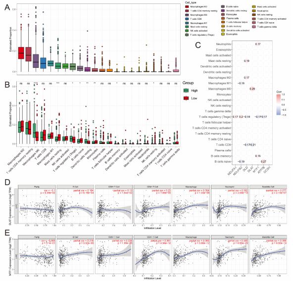 It is uncertain whether CRGs would influence the tumor immune microenvironment during the HCC progression. Thus, the enrichment scores of immune cells between the low- and highrisk groups in the TCGA cohort were calculated by CIBERSORT algorithm (Figure 5A), high-risk group had higher levels of several types of immune cells, such as M0 macrophages, regulatory T cells, resting dendritic cells and memory B cell, while resting mast cells, naïve B cells, monocytes, resting NK cells were significantly abundant in the low-risk group (Figures 5A,B). In addition, the correlation between the 7 signature genes and immune infiltration in HCC was also evaluated. Notably, among the seven genes, only the expression levels of DLAT and MTF1 were associated with all the immune infiltration levels of B cells (P<0.001), CD8+ T cells (P<0.001), CD4+ T cells (P<0.001) macrophages (P<0.001), neutrophils (P<0.001) and dendritic cells (P<0.001) (Figures 5C-E), the results for correlation between the other genes and the immune infiltration cells were shown in Figure S3. These findings suggested that cuproptosis may be involved in the immune regulation of HCC progression. Of course, it needs to be verified by further experiments.
