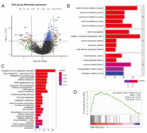 To analyze the potential mechanism of the risk signature, GO, KEGG and GSEA analysis of DEGs between high- and lowrisk group were performed and according to the criteria of adj P-value < 0.05 and |log2 Fold-Change (FC)| > 1.5 were considered statistically significant. We obtained 158 down-regulated genes and 72 up-regulated genes in the high-risk group (Figure 6A and Table S4). The significant GO enrichment was observed in some types of catabolic and metabolic biological processes; For the CC and MF category, GO enrichment was observed in collagen-containing extracellular matrix and oxidoreductase activity, etc. (Figure 6B). The results of KEGG analysis indicated that the DEGs were significantly enriched in many metabolism pathways like carbon metabolism, pyruvate metabolism (Figure 6C). Moreover, GSEA results revealed that some signaling pathways, such as MYC targets, angiogenesis, glycolysis, were up-regulated in the high-Risk group of HCC (Figure 6D). Taken together, these results demonstrated that 7-CRGs risk model played an important role in various cellar processes of HCC development.