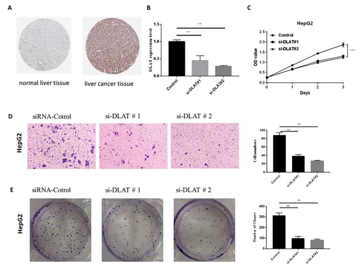 The migration of HepG2 cells was determined in a transwell chamber (Corning, USA) containing a polycarbonate filter with a pore size of 8μm. si- DLAT or si-scrambled siRNA was transfected into the cells then the cells were collected and resuspended in serum-free DMEM medium, 5×105 -106 cells/ml solution was added to the upper compartment of each chamber. The lower compartment contained 0.6 ml DMEM medium with 10% FBS. After incubation for 12 h or 24h at 37℃, the filter was removed and fixed with 4% paraformaldehyde. Cells on the lower surface of the filter were stained with 1% crystal violet and photographed by Carl Zeiss Axio Observer (ZEISS).
