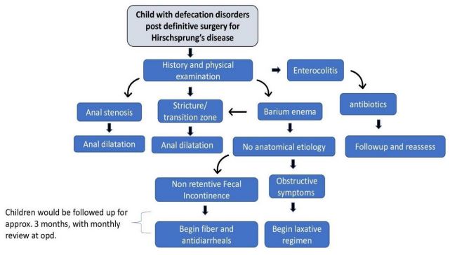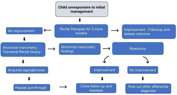 Children without improvement were considered for Anorectal manometry to rule out internal sphincter achalasia who have absent RAIR (Rectoanal Inhibitory Reflex) and other issues like rectal sensation and compliance. If symptoms continue to persist with abnormal manometry findings, internal sphincter myectomy is performed. (The main physiological prerequisites for fecal continence included, preserved sphincter function, rectal reservoir, and anal canal sensation), Trans anal rectal biopsy was done in children who do not improve and children with improvement were followed up to assess the outcome. Children with acquired aganglionosis were considered for repeat pullthrough. Children who improved were closely followed up to assess the outcome, children without any improvement finally were labeled to have intestinal dysmotility.