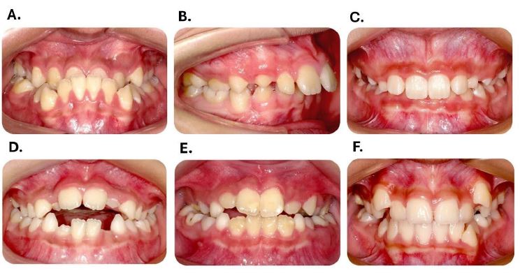 Malocclusion refers to the misalignment or incorrect positioning between the teeth of the upper and lower dental arches [1]. The occurrence of dental malocclusion is high in the general population with an estimated prevalence of 56%, with no gender differences [2]. The etiology of malocclusion can be dentoalveolar, skeletal, or a combination of the two elements. In the case of dentoskeletal malocclusion differences in the size, shape and/or position of the maxilla and the mandible contribute to the malocclusion phenotype [3,4]. Dental or dentoskeletal malocclusion can manifest in various forms, such as overbite, under bite, open bite, cross bite, dental crowding, or caused by several missing teeth (Figure 1).