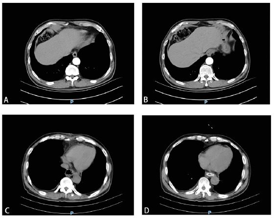 The patient, a 71-year-old male with a BMI of 23.4 kg/m2, underwent a gastroscopy on March 9, 2023, which revealed a cardia mass. Pathology confirmed adenocarcinoma. Preoperative thoracoabdominal Computed Tomography (CT) showed intact bilateral pleura without thickening, no pleural effusion, and an intact diaphragm (Figures 1A & 1B). On March 6, 2023, he underwent a laparoscopic radical total gastrectomy, D2 lymph node dissection, and esophagojejunostomy with Roux-en-Y reconstruction at our hospital. Histopathology revealed moderately to poorly differentiated gastric adenocarcinoma G3, with tumor staging of ypT3, ypN0 (0/22), L0, V0, R0, cM0. On postoperative day 17, a follow-up thoracoabdominal CT showed localized thickening of the bilateral pleura, a small amount of right pleural effusion, and the esophagojejunostomy located within the thoracic cavity (Figures 1C & 1D). The patient was discharged cured and received adjuvant chemotherapy thereafter.