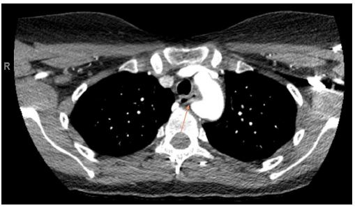 Dysphagia lusoria is a rare condition that occurs secondary to extrinsic esophageal compression by an aberrant right subclavian artery [1]. An aberrant right subclavian artery has a prevalence of 0.16-4.4% [2]. This anomaly is symptomatic in about 30% of cases identified by Figure 2. Dysphagia is the most common related symptom, reported in 90% of cases [1,2]. Other reported symptoms include cough, dyspnea, and chest pain [3].