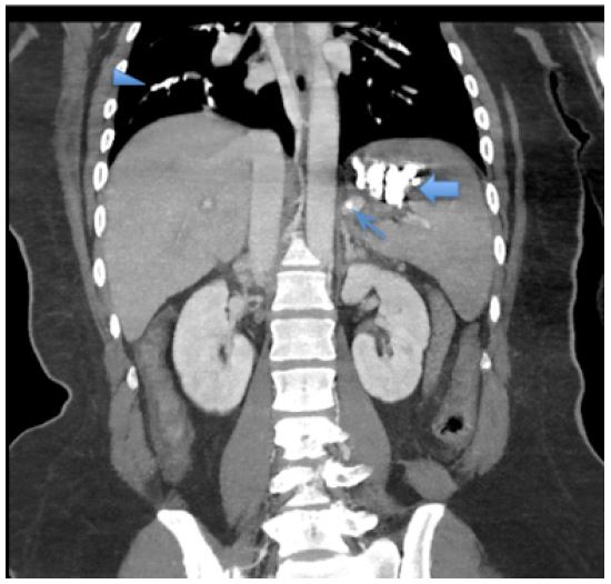 Following the procedure, there was a drop in oxygen saturation and development of tachycardia. The patient was subsequently intubated, ventilated, and transferred to a monitored setting. Thoracic CT angiography revealed bilateral massive non-thrombotic pulmonary embolism with dense infiltrates in pulmonary arterial areas affecting all segmental arterial branches. Embolization material was noted in the splenic vein (Figure 2). Intravenous steroids (dexamethasone 6 mg/day for 2 days, then gradually decrease by 2 mg every 2 days) and supportive management were initiated. Over the next two days, the patient’s oxygen requirements gradually decreased. She was successfully weaned off ventilation, extubated, and discharged home.