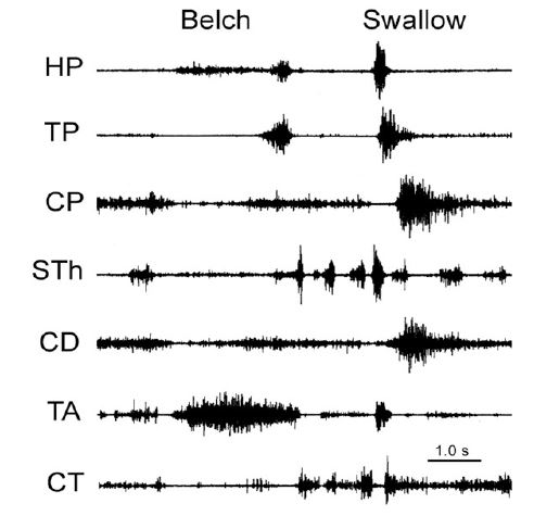 The function of these rapidly-adapting mucosal mechanoreceptors was defined by experiments which investigated the effects of removal of the mucosa from the esophagus. It was found that removal of this layer of the esophagus totally eliminated the activation of belching [30] and the reflex effects that occur during belching, but had no effect on EUCR, EECR or SP (Figure 1). These belch-related reflexes [30,34,50] are esophago-upper esophageal sphincter (UES) relaxation reflex (EURR) (Figures 1, 3, 4 & 6), Esophago-Glottal Closure Reflex (EGCR) (Figures 1 & 2), Esophago-Hyoid Distraction Reflex (EHDR) (Figures 1 & 3), and the Esophageal striated muscle Retrograde Peristaltic Response (ERPR) (Figure 4). Belching and all of these associated reflexes are activated by rapid injection of air into the esophagus [30,34,50], which correlates very well with the rapidly-adapting nature of the mucosal mechanoreceptors. In addition, belching and all of these reflexes are mediated by the vagus nerve [30,34], which is the afferent nerve of the rapidly-adapting mucosal mechanoreceptors. Therefore, the rapidly adapting mucosal mechanoreceptors mediate belching and its associated reflexes, which aid the process: EURR, EGCR, EHDR and ERPR.