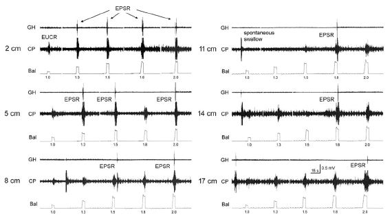 The functions of EUCR, EECR and 2P are complimentary, and when acting together unified. The EECR acts to block or inhibit the orad movement of any esophageal bolus orad of the stimulus [35], the EUCR acts to prevent esophago-pharyngeal reflux of the bolus [30] and SP acts to move distally a bolus orad of the stimulus [3,6]. Therefore, since all three reflexes are activated by the same stimulus in the same region of the esophagus [30], these three reflexes have a unified function of preventing any bolus remaining in the esophagus after the passage of peristalsis to be refluxed to the pharynx.