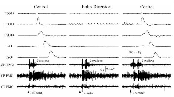 Another way in which the mucosal slowly-adapting tension mechanoreceptors function to promote bolus transport is by ensuring that the esophageal phase of swallowing follows the pharyngeal phase. It has been observed in various species [30,60,61] that diversion of the swallowed bolus from the esophagus prevents the initiation of the esophageal phase of swallowing (Figure 6). This occurs not only for swallows with a bolus, but also for non-bolus swallows [30]. Given that the receptor of this function must be very sensitive and close to the mucosal surface, it is highly likely that activation of the mucosal slowly adapting tension receptors mediates this function. Therefore, the mucosal slowly adapting tension mechanoreceptors of the esophagus activate two reflex responses that function to promote the transmission of the swallowed bolus from pharynx to stomach and prevent aspiration.