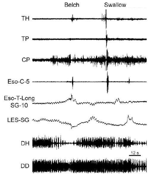 The function of this mechanosensitive inhibitory innervation is elimination of the esophago-gastric barrier, i.e., LES and crural diaphragm contraction. This response is an integral part of both swallowing and belching. During swallowing the peristaltic process activates distal esophageal longitudinal contraction [23,37,42,63] which is closely associated with both LES [23,29,62] and crural diaphragm [36,37,62] relaxation. Similarly, during belching (Figure 7) the gastric air bolus reflexly activates distal esophageal longitudinal contraction before initiation of the belch, and this response is closely associated with relaxation of both the LES and crural diaphragm [29,39,40,49,50]. The actual belch does not occur until the esophago-gastric barrier is reduced enough to allow gastro-esophageal reflux of the air bolus [50,62] which activates the rapidly adapting mucosal receptors [30,50], as described above.