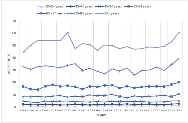 Age groups related mortality: Crude rate data for individuals aged 15 to 24 was inconsistent across most years and was therefore excluded from the analysis. The AAPC values for crude rates across different age groups were as follows: 1.203 for those aged 25 to 34, 0.862 for those aged 35 to 44, 0.117 for those aged 45 to 54, 0.438 for those aged 55 to 64, 1.055 (0.156 from 1999 to 2018 and 10.000 from 2018 to 2020) for those aged 65 to 74, 0.872 (-0.586 from 1999 to 2018 and 15.842 from 2018 to 2020) for those aged 75 to 84, and 0.611 (-0.529 from 1999 to 2018 and 12.127 from 2018 to 2020) for those aged 85 and older. Pairwise comparisons showed non-parallel results between the 25 to 34, 35 to 44, 45 to 54, and 55 to 64 age groups and the 65 to 74, 75 to 84, and 85+ age groups, indicating discrepancies in outcomes between younger to middle-aged adults and older adults. STATA analysis of crude rate trends produced a z-value of 12.24 (p>z=0.000). The Kruskal-Wallis test for independent samples rejected the null hypothesis of similar crude rate distributions across age groups with a p-value of 0.000. Additionally, the post-hoc Dunn’s test further validated the findings.