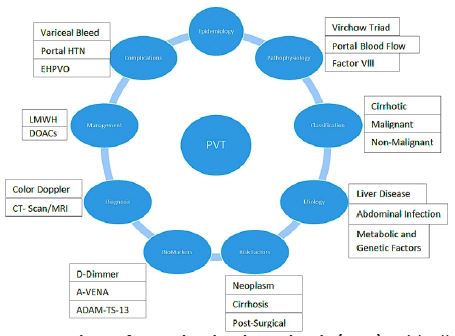 Portal Vein Thrombosis (PVT) is a noteworthy vascular disorder marked by the development of a blood clot in the portal vein and its branches, extending up to the Splenic Vein (SV) and superior mesenteric vein (SMV) [1,2]. It is characterized by partial or complete obstruction of the portal vein, which supplies 3/4th blood to the liver. This obstruction results in compromised hepatic perfusion, potential liver dysfunction and gastrointestinal bleeding [3-5]. This condition is also associated with severe complications such as increased portal venous pressure, variceal bleeding, intestinal ischemia, and liver failure, significantly impacting survival and prognosis [6]. PVT also presents significant challenges in liver transplantation, increasing both perioperative risks and technical difficulties It is most commonly seen in patients with liver cirrhosis, where it often results from portal hypertension, making individuals susceptible to complications like acute esophageal variceal bleeding [7]. In non-cirrhotic cases, PVT often stems from portal and splenic vein thrombosis, leading to variceal bleeding and splenomegaly [8]. PVT is also associated with malignancies, inflammatory conditions, and Myeloproliferative Neoplasms (MPNs), broadening its clinical context [9,10]. Inneonates, PVT is typically asymptomatic and often remains undiagnosed during this early stage of life [11]. Neonatal PVT is recognized as a key factor in the development of portal hypertension [11]. PVT is frequently a symptomatic and often discovered incidentally during routine imaging, particularly during the surveillance of Hepatocellular Carcinoma (HCC) or during hospitalization due to complications related to portal hypertension, such as esophageal variceal bleeding [12]. In cirrhosis, PVT serves as a marker of disease severity and is associated with worsened liver function, portal hypertension, and complications such as esophagogastric varices and ascites [13-15]. PVT is often asymptomatic and typically detected incidentally during routine surveillance imaging of Hepatocellular Carcinoma (HCC) or hospitalization due to complications of portal hypertension [12]. Diagnostic tools such as Doppler ultrasonography are crucial for confirming the diagnosis, as they offer high sensitivity for detecting portal vein occlusion [16]. A holistic overview of Portal Vein Thrombosis (PVT) for clinical research reference and descried in (Figure 1), followed by details sections below: